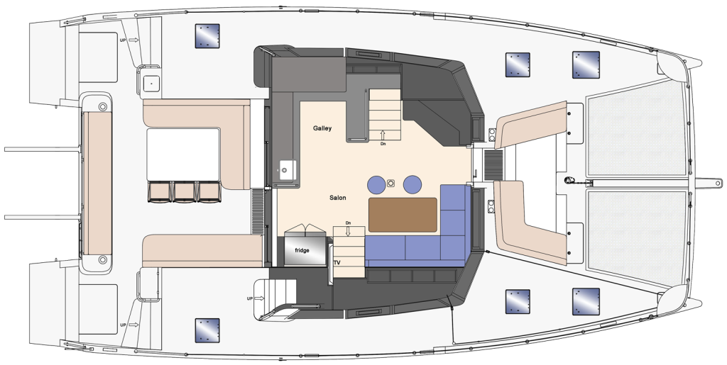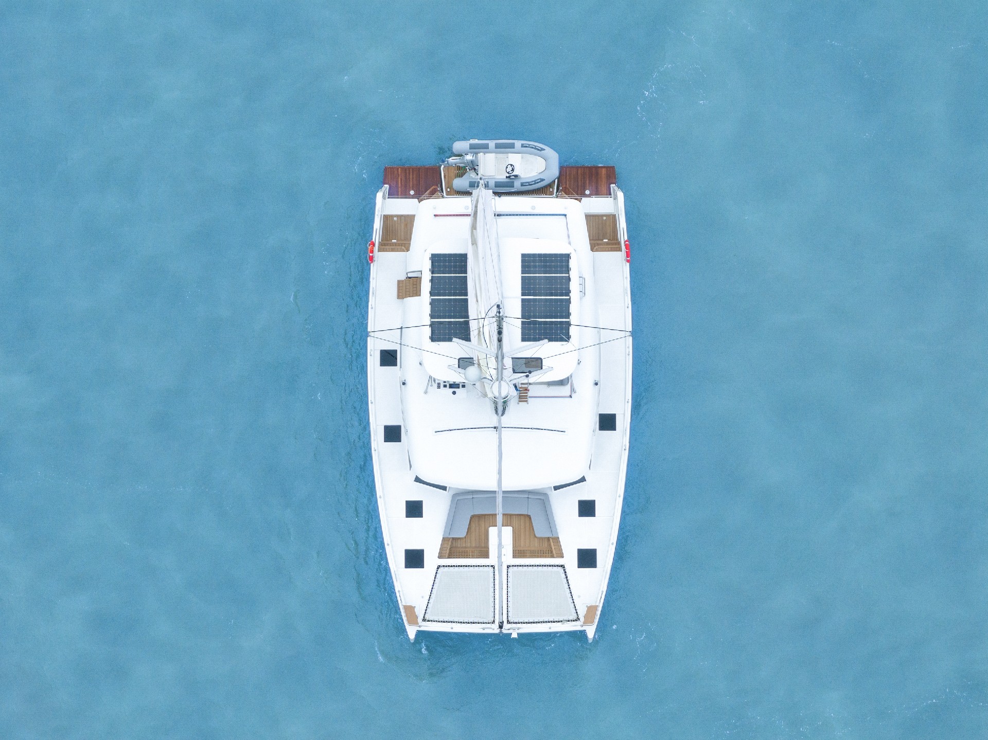 Flybridge is a versatile outdoor space with a barbecue, dining table, and sun lounges, serving as a perfect dining and sunbathing area. Solar panels (optional) installed on hardtop can convert collected solar energy into electricity, providing power for daily living needs on catamaran.
