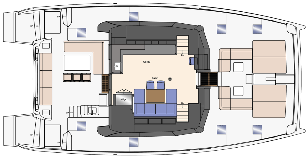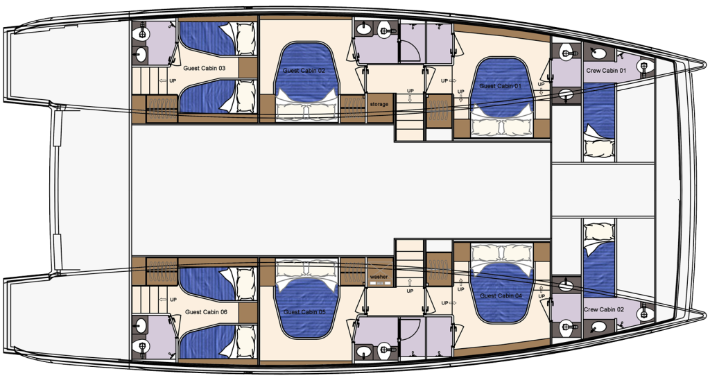 Experience the innovative design of the Seaview 56, where the flybridge offers an elevated vantage point for your enjoyment. Indulge in a delightful barbecue with your families and friends while relishing the grandeur of the open blue skies from the sun cushions, all while sipping on a refreshing drink. This sailing catamaran sets a new standard, seamlessly blending luxury, comfort, and functionality to redefine the possibilities of your sailing experience.Step into the elegant sanctuary of the Seaview 56’s salon on the main deck, where natural light streams in through expansive glass windows, illuminating the space from every angle. With dual doors at the front and rear, the salon beckons guests to seamlessly transition between the captivating vistas of the sea on both the foredeck and aftdeck. Embark on a journey of enchantment and exploration amidst the boundless beauty of the ocean.Upon setting foot on lower deck, you’ll be pleasantly surprised by the spaciousness, as Seaview 56 provides 30% more living space than yachts of a similar size. The lower deck boasts four to six cabins, each equipped with en-suite bathrooms, allowing not just solo journeys but collaborative adventures with your partners.
